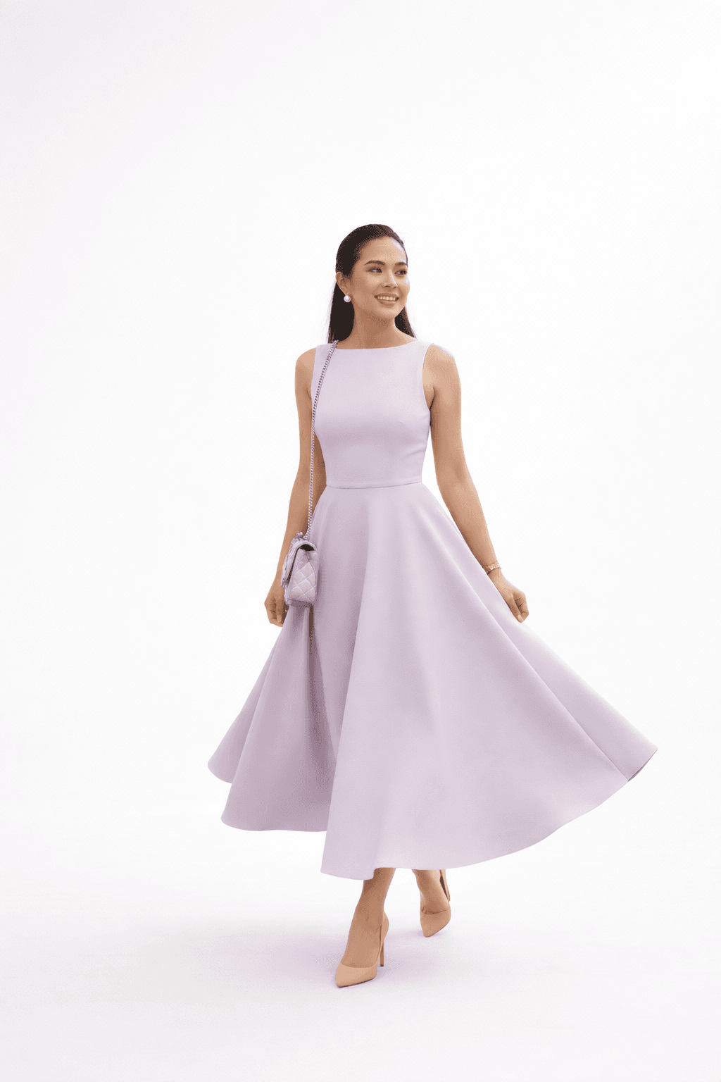 Te vas a enamorar de cómo este color ilumina tu piel de una forma casi mágica. El lavanda tiene ese “no sé qué” que te hace ver fresca, descansada y etérea. Al combinarlo con el vuelo de la falda plato y la elegancia del escote bote, logramos un diseño que se siente como un soplo de aire fresco en un día de calor. Es una pieza atemporal que te hace ver accesible pero misteriosa, como alguien que guarda un secreto encantador bajo la manga (o en este caso, bajo su impecable caída midi).